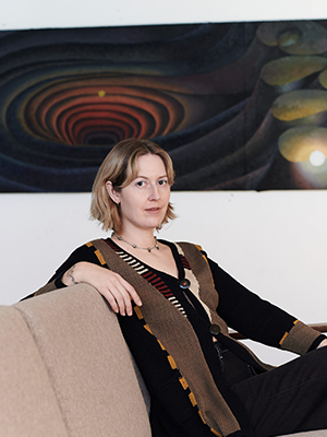 Alicia Adamerovich (b. 1989, Latrobe, Pennsylvania) is an abstract painter and sculptor who lives and works in Queens, New York. Adamerovich paints shadow-filled scenes whose undulating shapes are informed by Surrealism as well as by the symbolist compositions of Hilma af Klint. Her paintings respond to the natural world and that of science fiction; they are populated by twisting biomorphic forms that cast ink-black shadows or radiate with bright white internal light. Adamerovich first makes studies with pastel on paper before translating these compositions to canvas. She builds texture onto her stretched canvas supports with multiple layers of pumice, gels, sand, and paint to achieve uncanny effects of surface, depth, and atmosphere.These paintings are complimented by organic sculptures the artist creates from branches salvaged from the woods surrounding her parents’ rural Pennsylvania home, which she sometimes incorporates directly into her painted works. Other sculptures are self-standing and appear to shiver and writhe, as if the branches themselves had become invested with otherworldly powers. Adamerovich studied at the Maryland Institute College of Art and Pennsylvania State University before moving to New York. Her Queens studio includes a small woodshop and is where she constructs her sculptures piece by piece, using an aggregative and intuitive process.