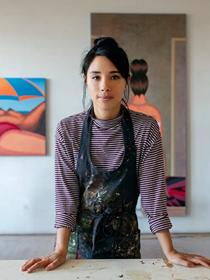 Born and raised in Paris, Curtiss studied at l’Ėcole des Beaux-Arts before moving first to Japan and then to New York, where she now lives and works. Employing a highly stylised visual language, she draws on a history of figurative painting including 18th- and 19th-century French painting, as well as the Chicago Imagists and the ‘pop’ imagery of comic books, manga and illustration. Her subject matter centres on the female body, through deconstructed and fragmented details like heads or legs, or the symbols of stereotyped ‘femininity’ such as long nails, flowing hair or high heels. In a similar manner to Post-Impressionist painters, Curtiss mines her subjects from contemporary, everyday life, representing its curious, small details in cropped and ambiguous compositions that are erotically charged, and cinematic and dreamlike in feel, interweaving the general and specific in ways that are at once fantastical, precise and unsettling. Through the use of unexpected juxtapositions, of subject with object, of the seen and the implied, and an exaggerated portrayal of cartoon-like forms, her paintings are infused with a direct and deadpan humour, revealing the uncanny within the banal and the grotesque and surreal undertones of human characteristics and behaviour.