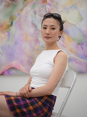 Kiki Xuebing Wang was born in 1993, Zhengzhou, China. She obtained her BFA from University of California, Los Angeles, in 2016 and her MA degree from the Royal College of Art in 2020. She currently lives and works in London. Fascinated with common visual patterns, both commercial and natural ones, and reflecting upon their role as cultural rhetorics, Wang’s practice delves into our mysterious instincts that charge the visual with emotions. The clinging relationship between feelings and objects is further addressed in her prismatic and grainy color which captures the reflected light radiating and escaping from the surface. What she depicts is both a twilight zone between light and the intrinsic color of objects and a saturating presence of the simulacrum world. As the intensity of emotions and memories fluctuates, Wang’s often labyrinthic canvas creates a multi-layered surface that not only probes her experiences but also disrupts the sense of distance in-between different boundaries, tellingly reexamining the two-dimensionality of paintings.