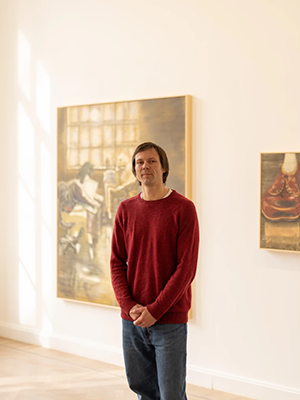 Throughout his early career, Franz has developed a captivating style of organic representation where viewpoints in his paintings are refracted, obscured, and through this brought closer to life. Directly confronting the complexity of contemporary existence, he approaches the medium of painting as a venture in witnessing and recording his time. In his paintings, muted earth tones are contrasted with shadowy outlines and full primary hues that comprise invented architectural spaces or uncanny perspectives. The pulling and pushing tension within his brushstrokes captures the sensation of heavy, enlarged forms giving way to more delicate arrangements, infused with the imbalanced weight and proportions one would find in a dream. Franz is careful to distance the viewer’s perspective from the interior of his paintings. He describes this process as “clinging to the inherent depth and secret of things.” Buried within his images the viewer searches for the face of a figure or the contours of the skyline. Amongst the seemingly unconnected locations pictured throughout his oeuvre he depicts the environment of the academy, onstage performances, and beds full of dreaming bodies. Throughout these scenes, the motif of collective longing is projected into a broader social context, as are suggestions of detachment, inaction, and rebelliousness. The artist’s early influences include American painters such as Jacob Lawrence and Romare Bearden, while he embraces the expressive grandeur inherited from his continental European predecessors and contemporaries, German painters such as Martin Kippenberger, Albert Oehlen, and Daniel Richter.