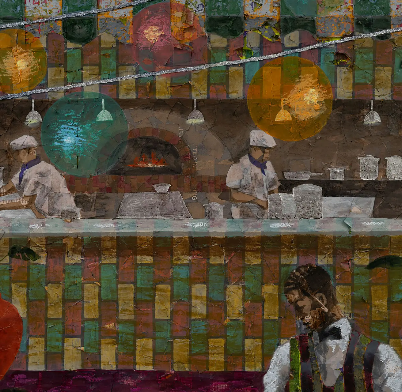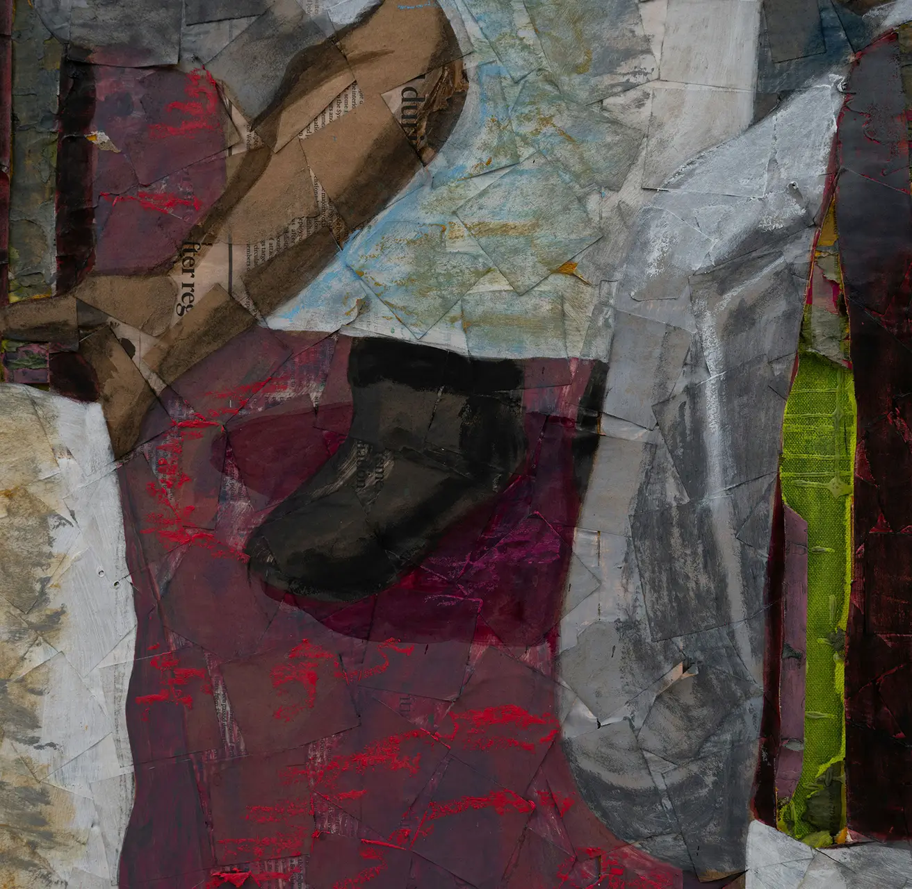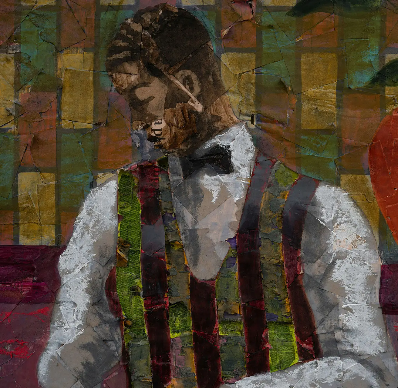Derek Fordjour (b. 1974, Memphis, Tennessee) makes paintings, sculptures, and installations whose exuberant visual materiality gives rise to portraits and other multilayered compositions. Born of both broad sociological vision and a keen awareness of the body’s vulnerability, Fordjour’s tableaux are filled with athletes, performers, and others who play key roles in cultural rituals and communal rites of passage. In his paintings, Fordjour methodically constructs the ground of each composition through a collage-based process involving cardboard, newspaper, and other materials and pigments. The varied and textural surfaces that emerge are as complex—and physically engaging—as the dynamic subjects that Fordjour inscribes on top, within, and through them. His ability to grapple with many strata of artmaking on physical, conceptual, and straightforwardly human terms alike allows his project to communicate the widest possible array of emotions, from celebration and ecstasy to melancholy and lamentation. This, in turn, allows Fordjour to connect to audiences inside and outside of traditional art venues.