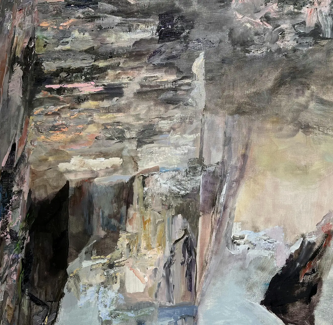 Francesca Mollett’s work derives from observations of her immediate environment. Drawings in charcoal, graphite and watercolour inform the composition of her paintings. Anchored in the physical negotiation of their making, her paintings are made with various techniques, including impasto accumulations of paint with a palette knife, thinned paint smeared and rubbed across the canvas, and large sweeping strokes of colour, a process which continues the sensation of an encounter.Mollett’s painterly technique engages a push and pull between luminosity, density, depth and surface. In particular, Mollett probes the phenomenology of iridescence, both in her experience of the world, and in the process of painting. Focusing on specific elements of an environment or place, such as doorways, rock formations, pools of water, and reflective and matte surfaces on buildings, she extracts from nature and place to produce an evocation out of time and place, yet very much materially present. Key to her process is a careful balancing of pure mark making – surface tension is created by the layering of painting marks, as they blend and contrast. Scale is abstracted, discernable forms are hinted at but never made evident, they are complicated or abstracted, constantly drawing the eye across the painted surface, allowing her painting to retain an intangible quality.