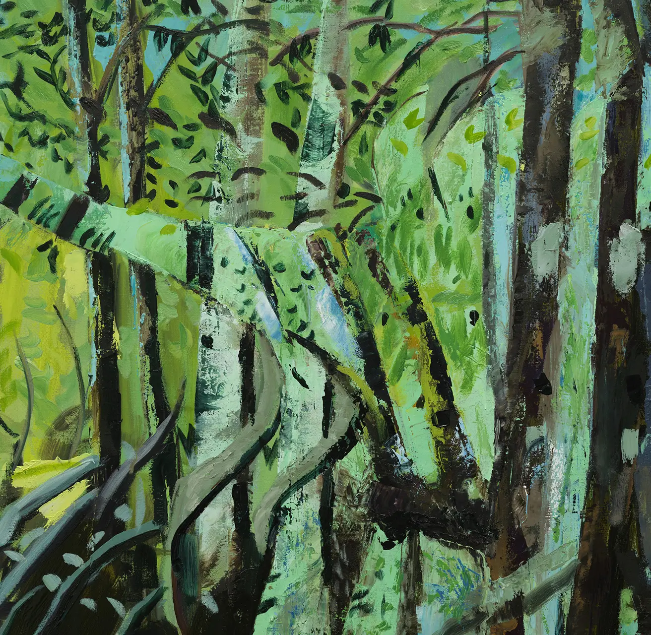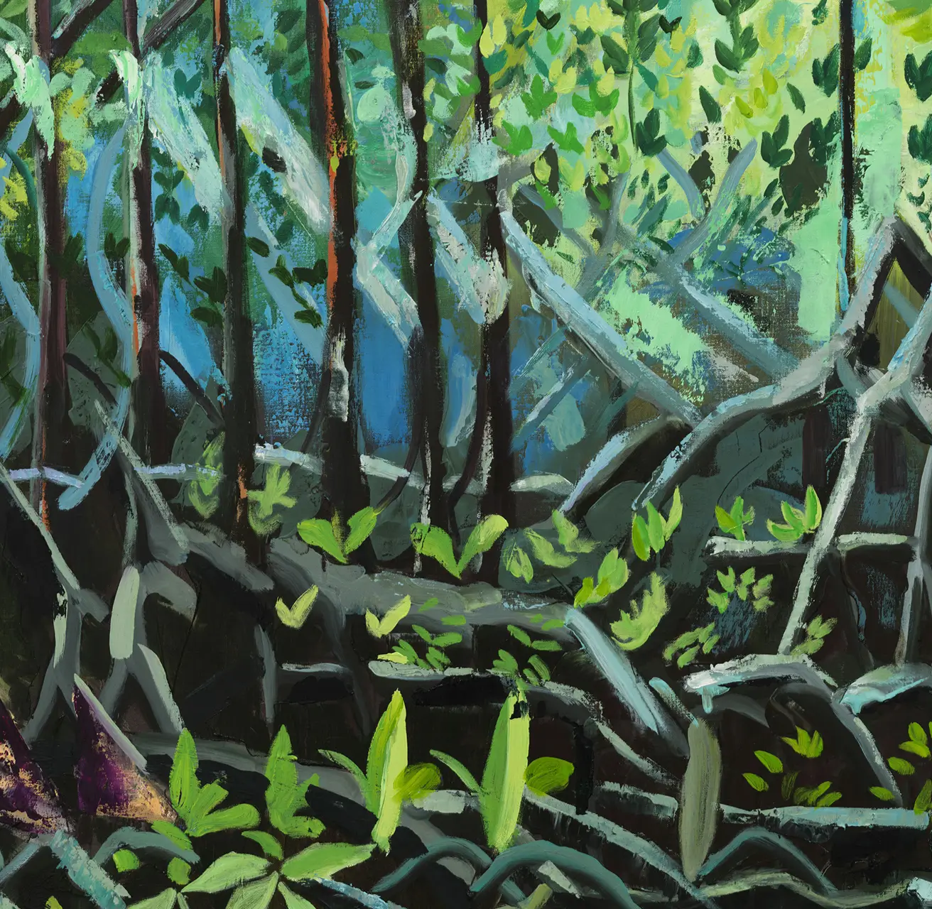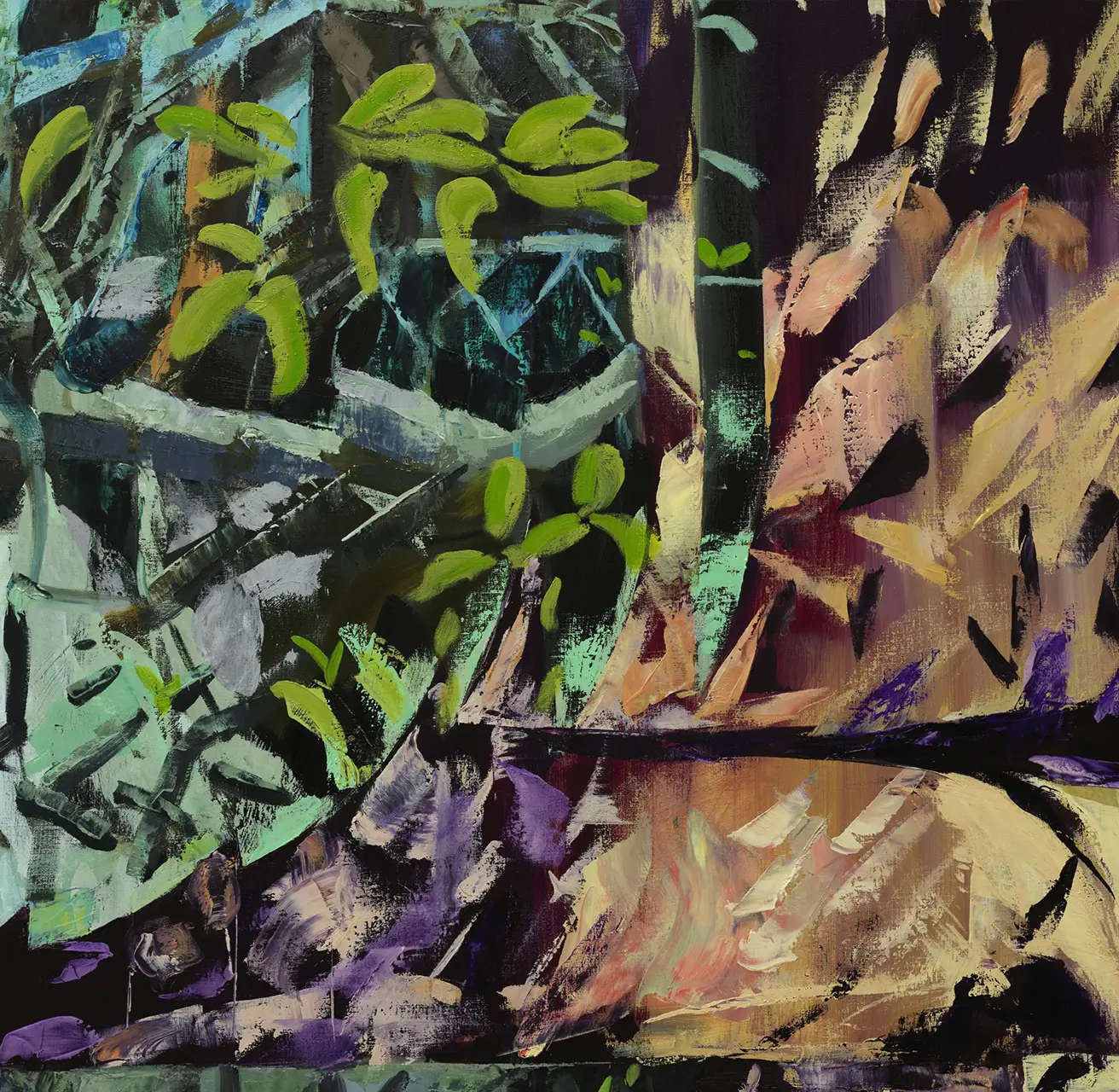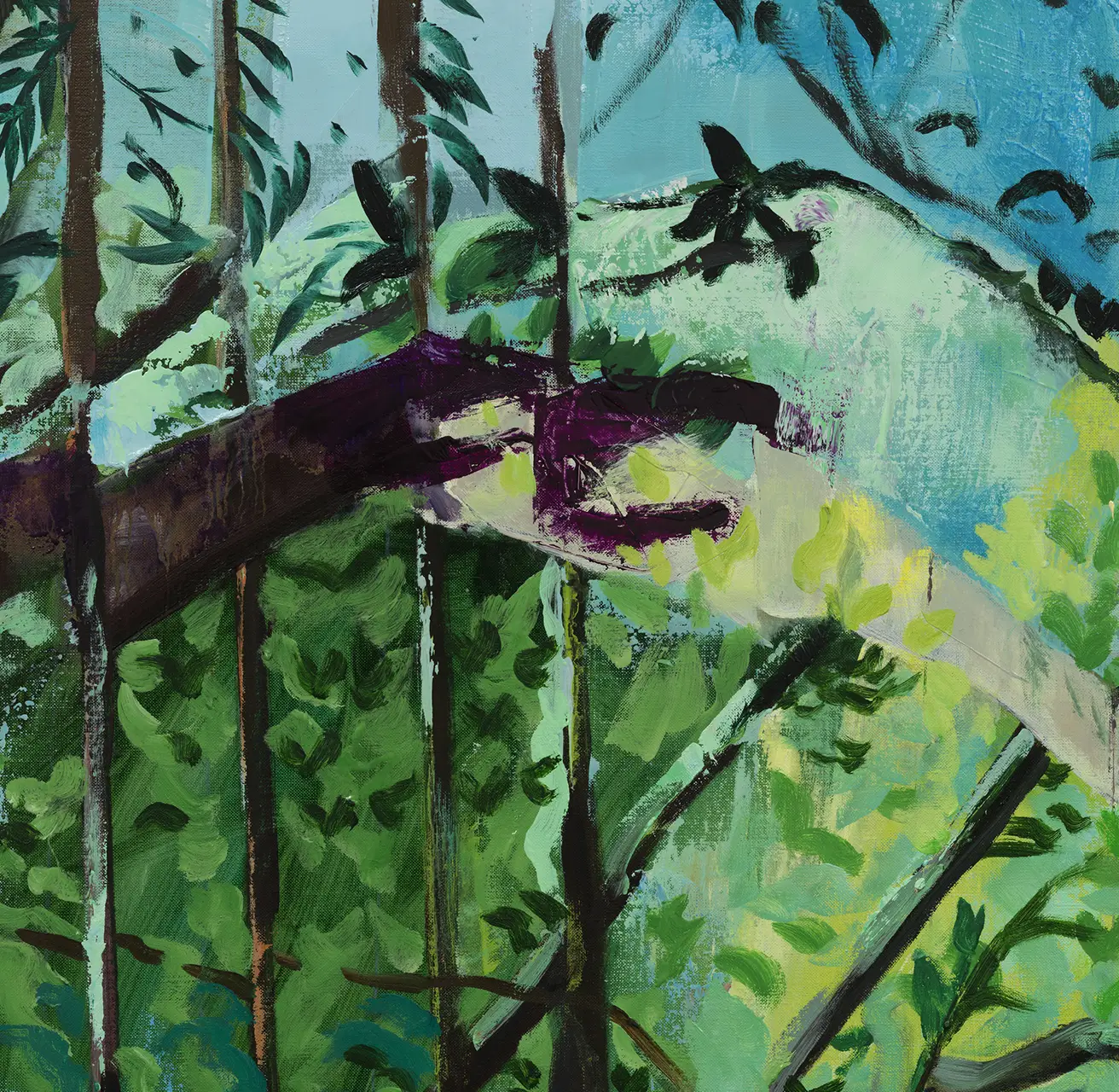 Maia Cruz Palileo (b. 1979, Chicago) creates paintings, works on paper, installations, and sculptures that honor familial archives and imagined contemporary realities. Beginning from a space of personal inquiry around their family’s migration from the Philippines to America, Palileo quickly uncovered the immense connective points between individual histories and broader global systems, like colonization, displacement, assimilation, and the Philippine–American War. The artist’s research into overlapping historical timelines, paired with the transmutational effects of memory, provides a framework for their color-rich compositions. This overlapping is made physical through the layering of oil paint, which—even in instances where one layer is concealed by another—permanently maintains its material presence on the canvas, creating its own recorded history. While painting has been at the center of the artist’s practice in recent years, Palileo utilizes their background as a sculptor to incorporate hands-on processes, from mixing their own paints, to making cardstock cutouts of drawings, and incorporating collage techniques to create preparatory sketches. By obscuring horizon lines and vanishing points, their paintings emphasize the densely varied landscapes—mountains, forests, bodies of water—present in the Philippines, while simultaneously foregrounding the figures represented in these archival materials and imbuing them with care, dignity, and presence of spirit that is often flattened in a photographic archive. For Palileo, these parallel modes of research open up narrative possibilities and account for some of the somatic information that gets lost to time and distance, filling in the gaps that emerge when people and families migrate outside of their ancestral land.